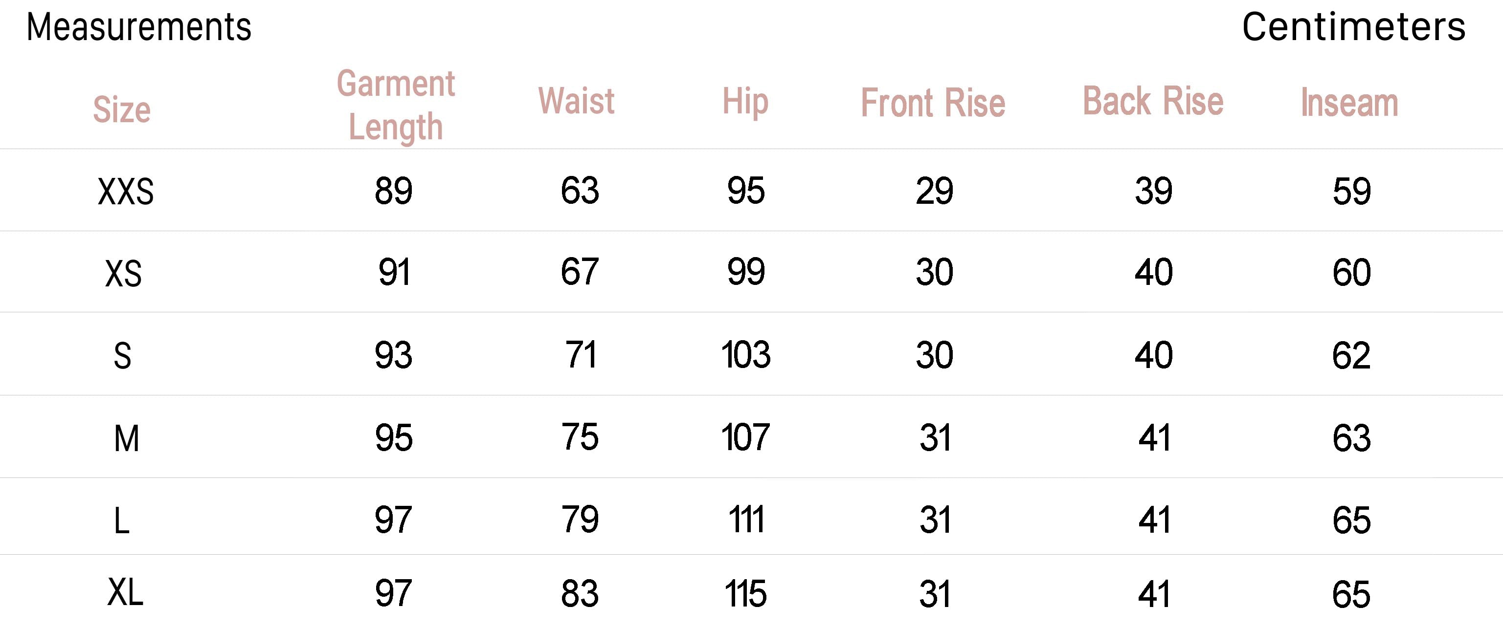 • Size XS - Inseam: 23.6", Rise: 15.6"
