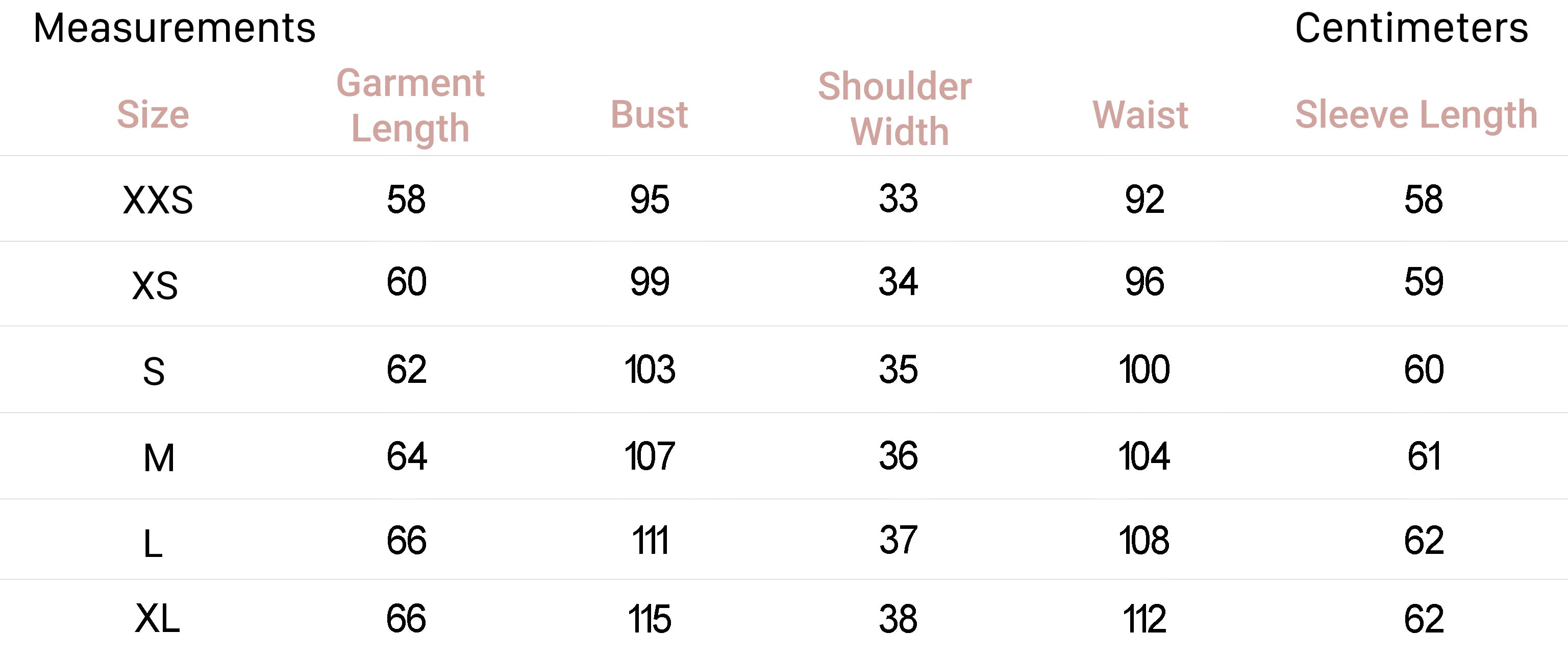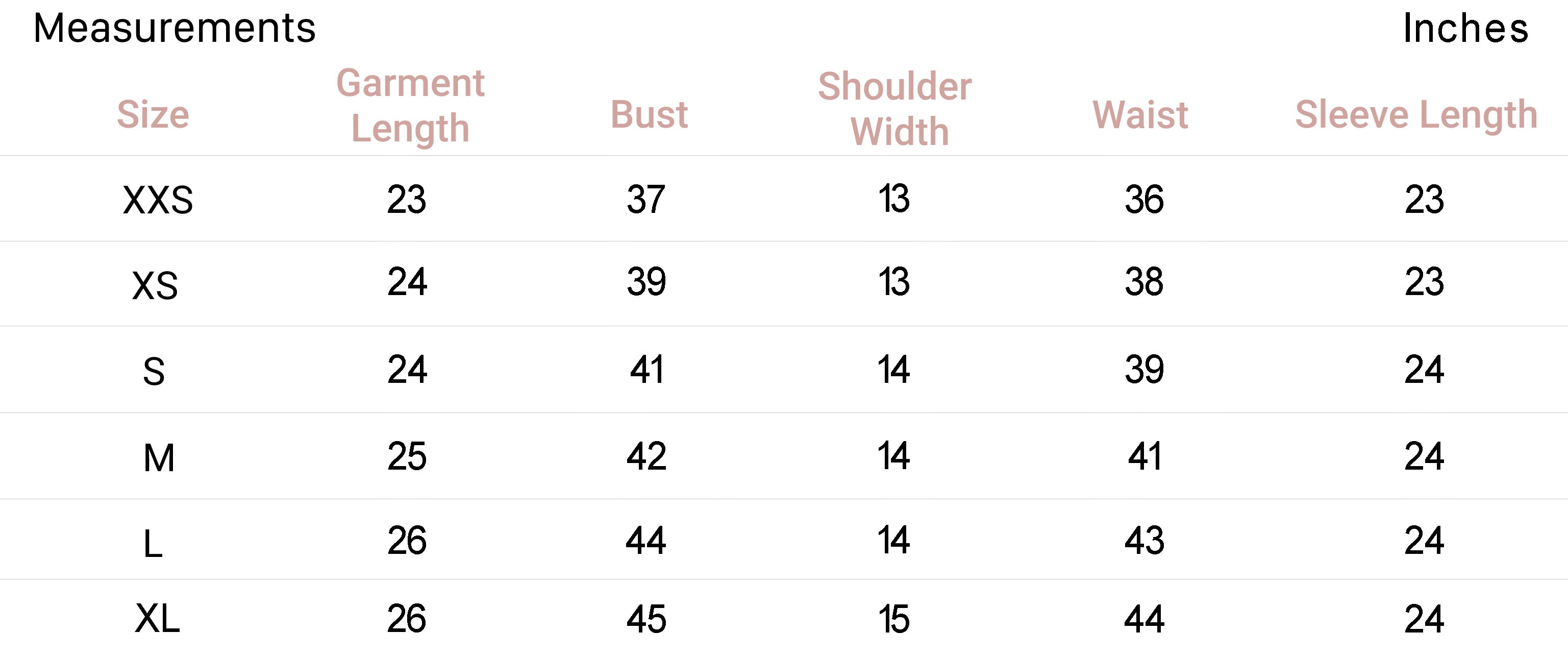 XS 2 34 6 31-32.5 25-26 34-35.5